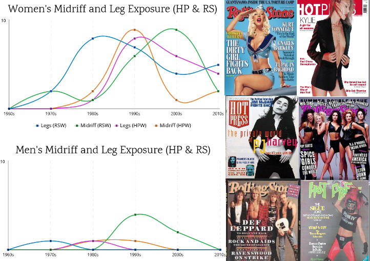 Moreover, while the experiences of women’s bodies in both publications are shared across time and across continents, body parts within each magazine are also closely tied and follow shared trends of exposure. Women’s arm and chest exposure within Hot Press follow extremely similar evolutions, and the same can be said for Rolling Stone.