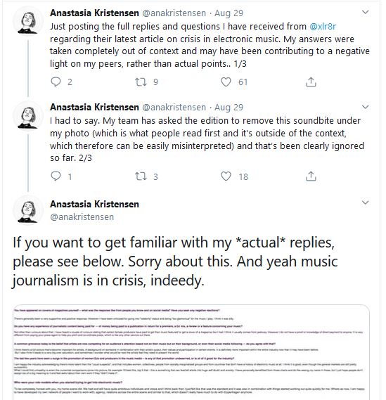 What readers were concerned about were comments relating to why minority artists, namely women in electronic music, gain visibility in the music industry. Having quoted a rumour that some women producers have paid their way onto magazine covers, and the interviewee stating that they had no actual proof to support this claim, the author stated, “But it sometimes feels as though magazines are choosing to cover minority artists with little consideration for how good their music is, promoting an image of diversity at the expense of genuine critique” (XLR8R, 2019). Read the full article here.