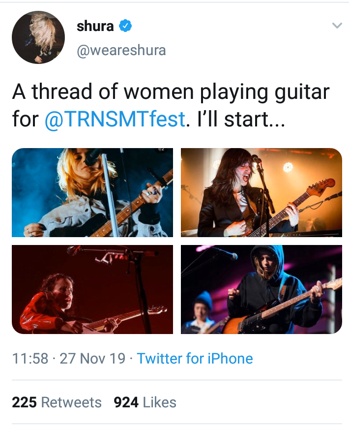 There was a huge response to Geoff’s comments on social media, with many artists proving that women do in fact play guitar, and do play in bands. One thread created by Shura (pictured below) did a great job of highlighting this.