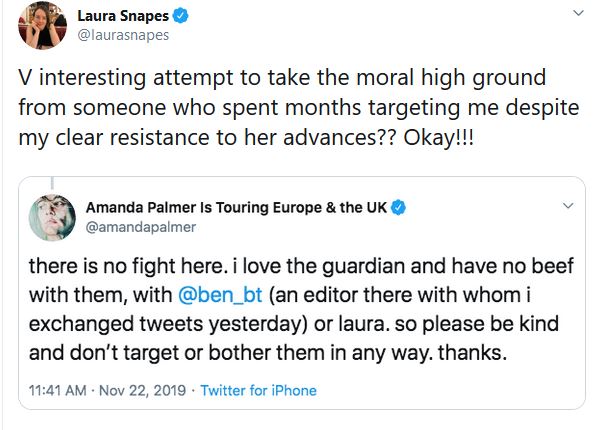 Late this year (again, what is the deal with November and social media outbursts?) American songwriter Amanda Palmer took to Twitter to express her outrage at the Guardian not covering her UK tour. Palmer specifically took aim at Laura Snapes, Guardian deputy music editor. Over the course of 6+ hours, a narrative emerged which detailed how Snapes had in years gone by been victimised by Palmer and subsequently had to block her on social media. Palmer, now furious, began a tirade of anger, and in some of her tweets weirdly enough included some compliments for the newspaper alongside her targeted lashings. What strange times we live in.